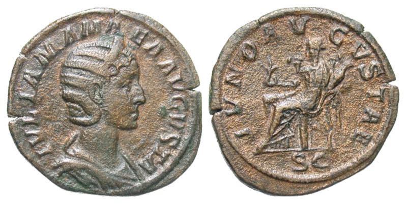 Julia Mamaea. Augusta, A.D. 222-235. Æ sestertius (28.9 mm, 21.87 g, 1 h). Rome mint, Struck A.D. 231. IVLIA MAMAEA AVGVSTA, draped bust right, wearing stephane / IVNO AVGVSTAE, SC, Juno seated left, holding flower and infant. RIC 683 (S Alexander); BMCRE 759 (S Alexander). VF, light brown patina.