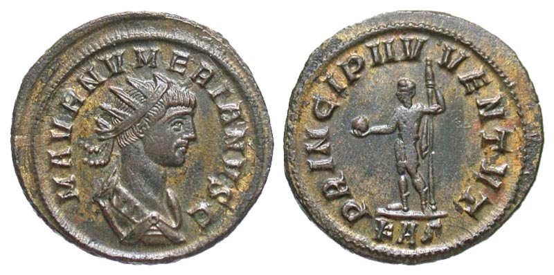 Numerian. As Caesar, A.D. 282-283. Æ antoninianus (22.0 mm, 3.93 g, 1 h). Rome mint, Struck A.D. 282. M AVR NVMERIANVS C, radiate and cuirassed bust right / PRINCIPI IVVENTVT, Numerian standing left, holding globe and long scepter; KAA in exergue. RIC 363. EF strike, sharp! Golden highlights.