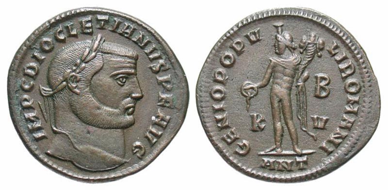 Diocletian. A.D. 284-305. Æ follis (27.1 mm, 8.67 g, 5 h). Antioch mint, Struck ca. A.D. 300-301. IMP C DIOCLETIANVS P F AVG, laureate head right / GENIO POPV-L-I ROMANI, Genius standing left, holding patera and cornucopia; B/K-V/ANT in exergue. RIC 54a. VF.