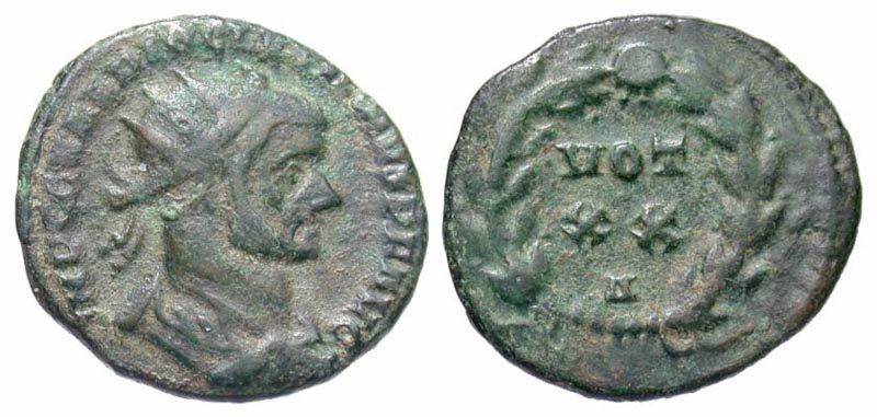 Diocletian. A.D. 284-305. Æ radiate fraction (20.2 mm, 3.57 g, 6 h). Rome mint, Struck A.D. 297-298. IMP C C VAL DIOCLETIANVS AVG, radiate and draped bust right / VOT/ ·/ XX, legend in two lines within wreath, Δ below. RIC 77a. VF, green patina.