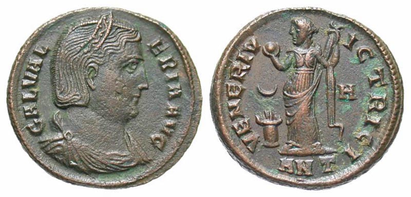 Galeria Valeria. Augusta, A.D. 293(?)-311. Æ follis (23.3 mm, 6.96 g, 11 h). Antioch mint, Struck A.D. 310. GAL VALERIA AVG, pearl-diademed and draped bust right / VENERI VICTRICI ·, Venus standing facing, head left, holding apple and raising drapery over shoulder, altar to left; crescent - H, ANT in exergue. RIC 138. VF, light porosity.