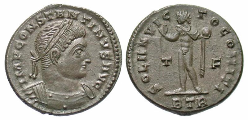 Constantine I. A.D. 307/10-337. Æ follis (19.7 mm, 3.89 g, 7 h). Trier mint, Struck A.D. 316. IMP CONSTANTINVS AVG, laureate and cuirassed bust right / SOLI INVICTO COMITI, Sol standing left, holding globe; T-F in fields, BTR in exergue. RIC 102. gVF.