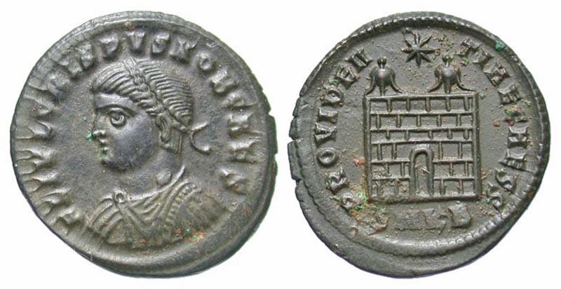 Crispus. Caesar, A.D. 317-326. Æ 3 (19.9 mm, 2.77 g, 11 h). Cyzicus mint, Struck A.D. 324-325. FL IVL CRISPVS NOB CAES, laureate, draped and cuirassed bust left / PROVIDENTIAE CAESS, camp gate with a star and two turrets above; SMKB in exergue. RIC 25; LRBC 1161. aVF.