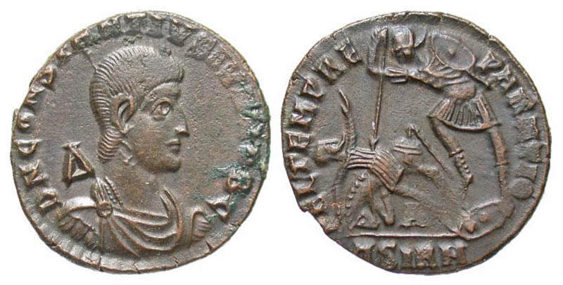 Constantius II. A.D. 337-361. Æ centenionalis (22.6 mm, 4.60 g, 7 h). Sirmium mint, Struck A.D. 351-355. D N CONSTANTIVS P F AVG, pearl-diademed, draped and cuirassed bust right; Δ behind head / FEL TEMP REPARATIO, soldier spearing fallen horseman; BSIRM in exergue. RIC 34; LRBC 1593. VF.