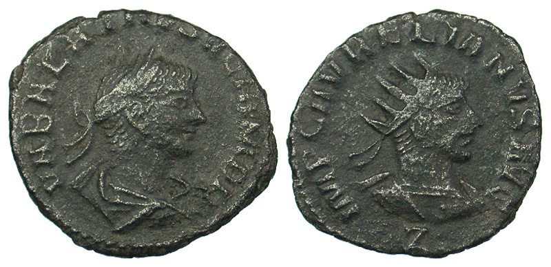 Vabalathus. Usurper, A.D. 268-272. Æ antoninianus (21.4 mm, 3.69 g, 1 h). Antioch, A.D. 271-272. VABALATHVS VCRIM DR, laureate, draped, and cuirassed bust right / AVRELIANVS AVG, radiate and cuirassed bust right, Z below. RIC 381. aVF, porous.
