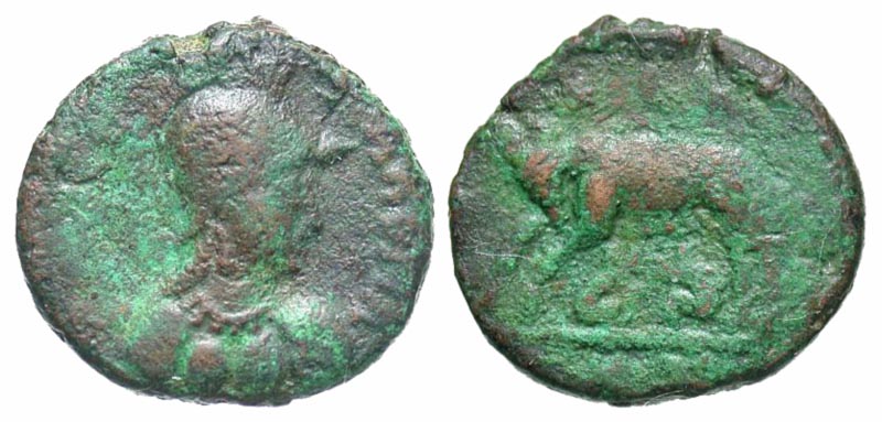Ostrogoths. Athalaric. 526-534. Æ 20 nummi - half follis (20.8 mm, 8.33 g, 5 h). Rome mint. Rare. INVICTA ROMA, helmeted and cuirassed bust of Roma right / She-wolf standing left, head lowered right, suckling Romulus and Remus; XL above; ·IIII· in exergue. MIB 70; MEC 93-94; BMC 27. Fine, green patina.
