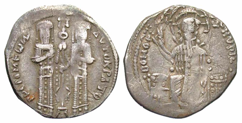 Andronicus II and Michael IX. 1295-1320. AR Basilikon (22.0 mm, 2.09 g, 5 h). Constantinople mint, Struck 1304-1320. Scarce. Christ, nimbate, enthroned and holding Gospels / Andronicus and Michael standing facing, holding patriarchal cross on base between them. SBV 2402; DOC 524. Toned Fine.