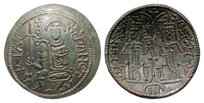 Hungary. Bela III. 1172-1196. AE Rézpénz (25.3 mm, 3.13 g, 3 h). RЄX BЄLA (retrograde) RЄX STS, Bela and Stephen seated on facing on throne, holding long cross / SANCTA mARIA, Madonna seated facing, holding scepter and the infant Jesus. Huszár 72; Réthy 15. EF.
