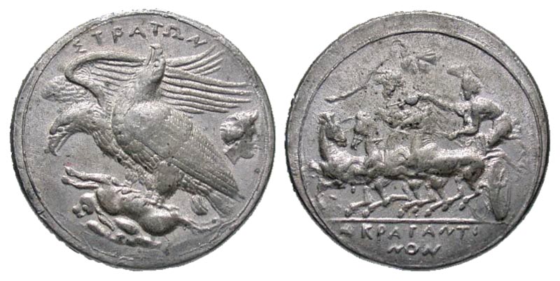 Sicily, Agrigentum. 409-406 B.C. PB tetradrachm (26.3 mm, 16.80 g, 6 h). BIFACE LEAD / ROSA OFF-METAL TRIAL STRIKE. ΣYPATΩN, sea-eagle grasping hare left, small male head to right / AΓPAΓENTINΩN, Charioteer driving quadriga left, olive branch above; BECKER BMC 58 on edge. cf. BMC 58; CD-10. EF.
