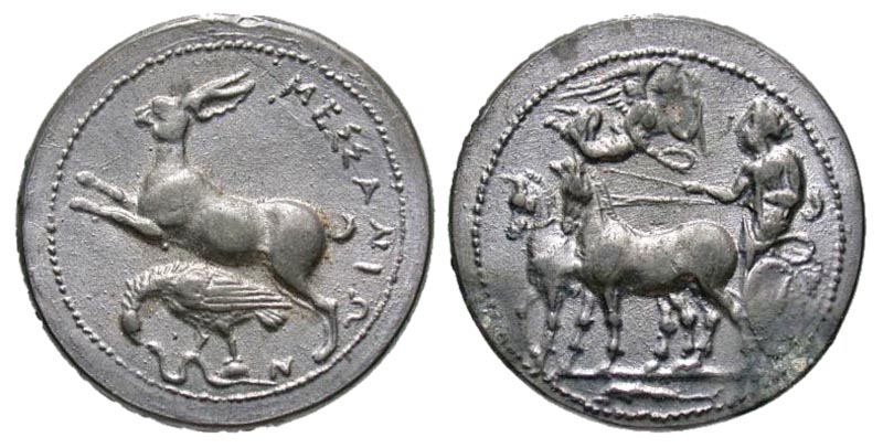 Lot 37-332. Sicily, Messana. 412-408 B.C. PB tetradrachm. Obverse die signed by Simin-. BIFACE LEAD / ROSA OFF-METAL TRIAL STRIKE.
