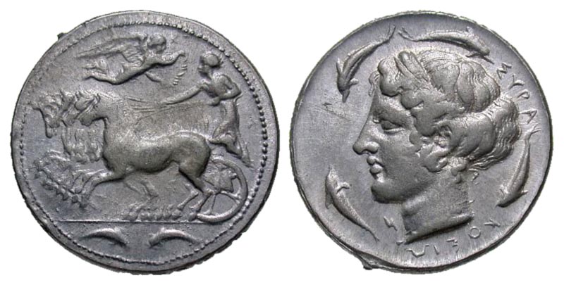 Sicily, Syracuse. Dionysios I. 405-367 B.C. PB tetradrachm (27.1 mm, 16.82 g, 6 h). BIFACE LEAD / ROSA OFF-METAL TRIAL STRIKE. Charioteer driving quadriga left, Nike flying right above, two dolphins swimming right below / ΣYPAKΩΣIΩN, Diademed head of Arethusa right; four dolphins around. BECKER BMC 155 stamped into the edge. cf. BMC 155; CD-156. EF.