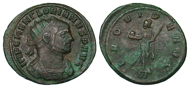 Florian. A.D. 276. Æ antoninianus (23.7 mm, 3.61 g, 5 h). Ticinum. IMP C M AN FLORIANVS P AVG, radiate and cuirassed bust right / PROVIDE AVG, Providentia standing left, holding globe and transverse scepter; VI in exergue. RIC 85 var. aVF, green adhesions.