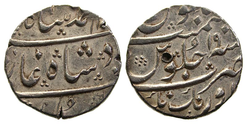 INDIA, Mughal Empire. Nasir al-Din Muhammad Shah. 1131-1161 / 1719-1748. AR rupee (25.4 mm, 11.47 g, 2 h). Aurangnagar, year 19. KM 436.9. EF.