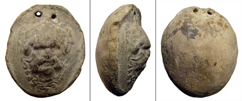 A Greek Terracotta Loom Weight with Bearded Male Face. A Greek terracotta loom weight with bearded male face, c. 5th - 4th Century BC, of oval shape, the backside rounded. On the facing side a nicely molded image of the face a bearded man, showing good style and detail. Two holes at top for suspension. L: 3 ï¾¼ï¾ (8.3 cm). Intact, traces of pigment. A neat example! Ex Orange County private collection. Est Value $300 - $400.