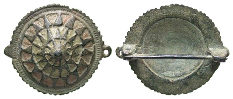 Roman Shield Fibula. 1st-4th centuries A.D. Intact with circular triangle design. 36 mm, 12.48 g.