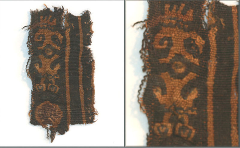 Roman Egypt Coptic Linen Textile Fragment Decorated with an Animal. An extremely interesting textile fragment with extensive unusual decorations. The piece measures 2 x 3.75 inches, (50 X 90 mm), is intact as a fragment, has shows various textures brown and tan colors.