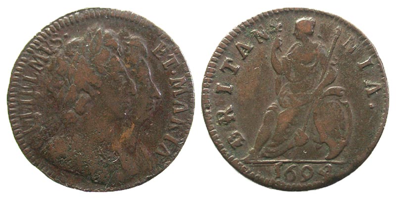 Lot 5-249. British, House of Orange. William III and Mary. 1688-1694. Æ farthing. 1694.