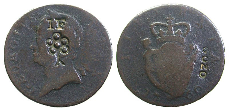 Malta, Gozo Island. 1 Franc (28.7 mm, 7.65 g, 6 h). Host coin: George II half penny of Ireland, dated 1760. c/ms: tree and IF / cm: GOZO. VG, cm's EF. Ex Chris Denton, London. Gozo Island is located off the southern coast of Malta. Napoleon conquered the island in 1798 and controlled it until 1802. During this time, foreign coins, especially those from the UK and Sicily circulated on the island. The countermarks were applied to create legal trade tokens. These tokens are quite rare.