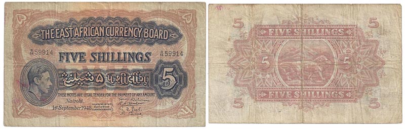 Lot 5-276. East African Currency Board, Five Shillings, 1943. Fine, unlisted date.