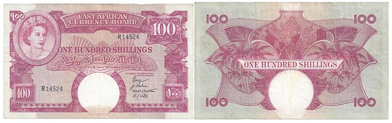East African Currency Board, 100 Shillings, 1958-1960. Crowned bust of Queen Elizabeth II / Coconut palm trees and flowering plants. Watermark: Lion's head. 6.25 x 3.75 inches. Pick 40. VF.
