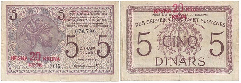 Lot 5-281. Yugoslavia, Five Dinars (20 Kronen overprint), 1919. VF.