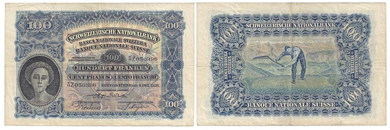 Switzerland, 100 Francs, 1928. Female head facing / Farmer wielding a scythe. Folded. 7 x 4.5 inches. Pick 35e. aVF.