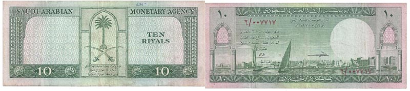 Saudi Arabia, Ten Riyals, 1961. Dhows in Jedda harbor / Palm tree over crossed swords. Minor edge wear and staining, ink mark on reverse. 6.5 x 2.75 inches. Pick 8. VF.