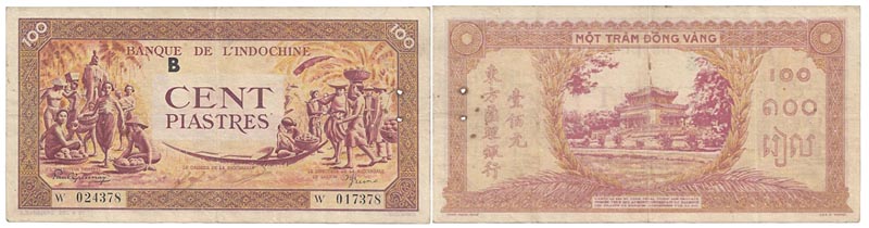 French Indo China, 100 Piastres, 1945. Letter B. Market scene / Temple. Small burn marks. 7 x 3.5 inches. Pick 66. VF.