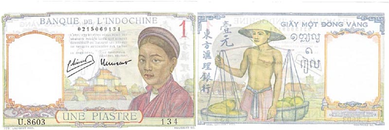 French Indo China, One Piastre, 1949. Woman standing in front of a temple / Man carrying fruits. Watermark: Winged head of Hermes/Mercury. 5 x 3.25 inches. Pick 54d. UNC, gem crisp.