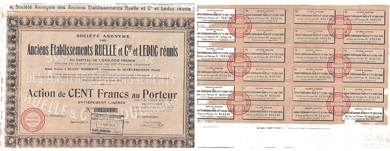Bonds: French 1928, Anciens Atablissements Ruelle et Cie et Leduc Reunis. Au capital de 1.240.000 Francs. Action de Cent Francs au Porter. With coupons. 12.5 x 8.5 inches. VF.