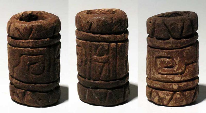 Maya Sello. An excellent Maya sello (roller seal) from Guatemala, c. 400 – 800 AD. This hollow example is 2-1/2” long and is decorated with a central register of recurved step-fret designs, surrounded by linear and triangular elements. In excellent condition, with strong mineral deposits and signs of extensive usage. Ex Walley collection. Value range $250 - $400.