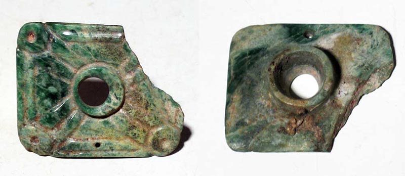 Maya Jade Ear Flare. A fine Maya ear flare from Guatemala, c. 400 – 800 AD. It is 1-3/4” wide and is made from gorgeous green jade. The intricate design, quality of the workmanship and type of stone all point to this having been worn by a member of the elite. Lost corner, good mineral deposits. Ex Walley collection. Value range $210 - $350.