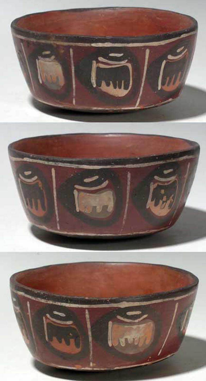 Nazca Bowl. A fine Nazca polychrome bowl from Peru, c. 200 – 400 AD. This delicately made vessel is 4-1/2” in diameter and is decorated with a series of beans, each quite different. The are painted against a red background and separated by linear elements. Certain types of beans were kept as good luck charms, other were used to communicate hidden message. Intact, vivid paint. Ex Caravallo collection. Value range $375 - $500.