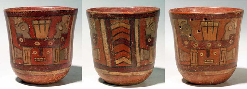 Huari Deity Jar. A fine Huari polychrome jar from Peru, c. 650 – 800 AD. This fine beaker with flared rim is 4” high and features two depictions of a deity wearing a complex headdress studded with a pair of condor heads and central feather element. The two primary panels are separated by panels of chevron designs which are characteristic of the Highlands style. Five small drill holes are evidence of the ancient repair of a crack, which has now been expertly restored. The restorer did not hide the drill holes, as they are rare, show ancient usage and communicate the importance of this vessel to its ancient owner. Ex Caravallo collection. Value range $375 - $500.