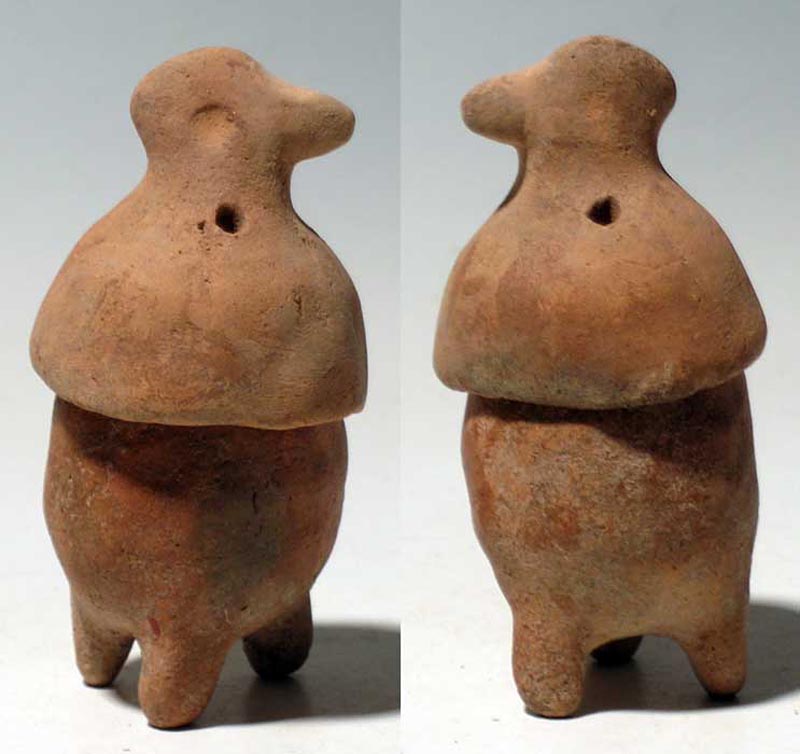 Colima Snuff Jar. A fine Colima snuff container from West Mexico, c. 300 BC – 300 AD. It is 3-1/2” high and consists of a tripod base topped with a lid that is adorned with the head of a bird. Both parts are perforated for attachment of a closure. Intact, good mineral deposits. Ex Arnold collection. Value range $250 - $400.