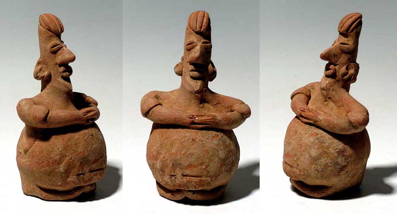 Colima Rattle Figure. A rare Colima figure from West Mexico, c. 300 BC – 300 AD. It is 4” high and depicts a seated individual with legs crossed and hands folded. He is wearing a loincloth and is adorned with ear ornaments, bracelets and a jaunty coif. The rotund body is hollow and contains rattles. Ex Arnold collection. Value range $300-$400.