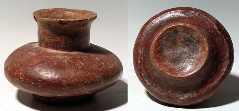 Jalisco Jar. An excellent Jalisco jar from West Mexico, c. 200 BC – 350 AD. This rare lentoid squash form is 5” in diameter, 3-1/2” high and has highly burnished red slip. Intact, with strong mineral deposits and signs of extensive usage. Ex Don Elder. Value range $190 - $300.