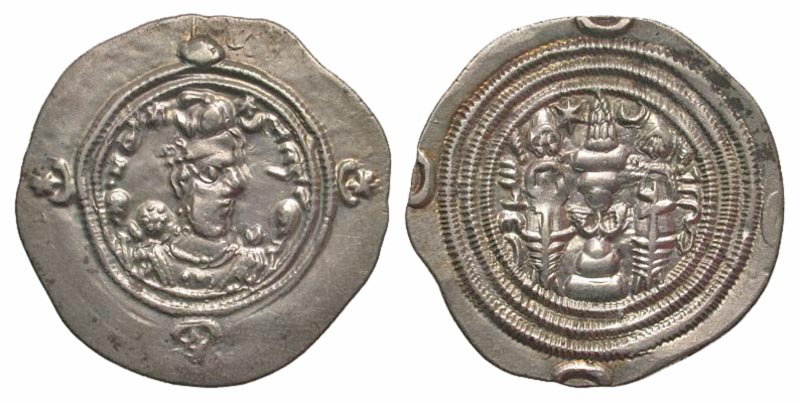 Lot 38-048. Sasanian Kingdom. Khusru II. A.D. 591-628. AR drachm. WYHC (Veh Az Amid Kavad), Dated year 1. Rare first year issue.