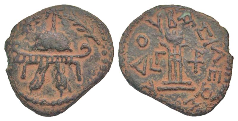 Lot 38-059. Judaea, Herodian Kingdom. Herod I. 40 B.C.E.-4 B.C.E. AE 8 prutot. Samarian mint, Dated year 3 = 40/39 BCE.