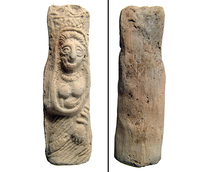 Mesopotamian Votive Idol. A terracotta votive idol, Mesopotamia, c. 2200 – 1800 BC, press-molded, wearing an elaborate headdress, wide almond-shaped eyes and exposed breasts. H: 4 1/8” (10.6 cm). Intact with good detail. Ex old English private collection. Value Range $600 $700.