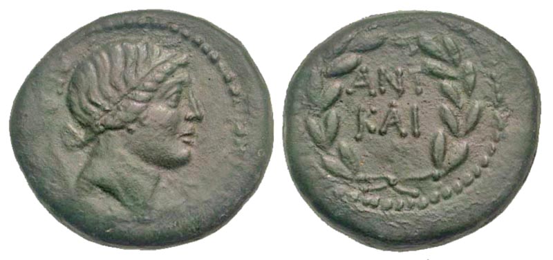 Macedon, Thessalonica. Marc Antony and Octavian. ca. 37 B.C. AE 25 (24.5 mm, 10.17 g, 1 h). Dated RY 5 = 37 B.C. AΓΩNOΘEΣIA, head of Agonothesia right / ANT KAI, legend in two lines within wreath. RPC 1552; SNG Copenhagen 375; SNG ANS 819. VF. Scarce.