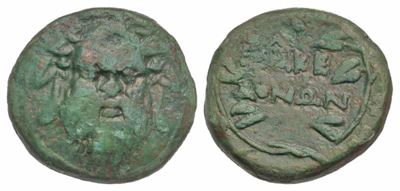 Macedon, Roman Protectorate. 142-141 B.C. AE 23 (22.6 mm, 10.92 g, 1 h). D. Junius Silanus Manlianus, praetor. Facing mask of Silenos, D MAKE ΔONΩN, legend within ivy wreath. AMNG 212; SNG Cop 1324. VF, green patina.