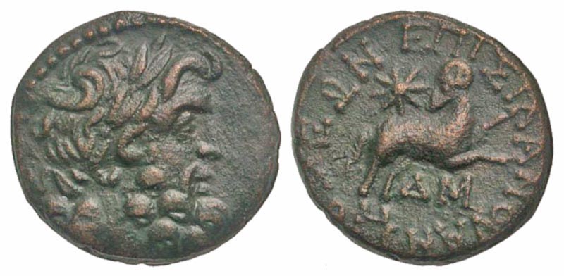 Syria, Seleucis and Pieria. Antiochia ad Orontem. Civic Issue. Time of Nero, A.D. 54-68. AE trichalkon (20.3 mm, 7.21 g, 10 h). Dated year 44 of the Caesarean Era (A.D. 12/13). ANTIOXEΩN, turreted and veiled bust of Tyche right / EΠI KOVAΔOPATOV, ΔM, ram leaping right, head left; star and crescent moon above, date below. McAlee 99; RPC 4269; BMC 65. VF.