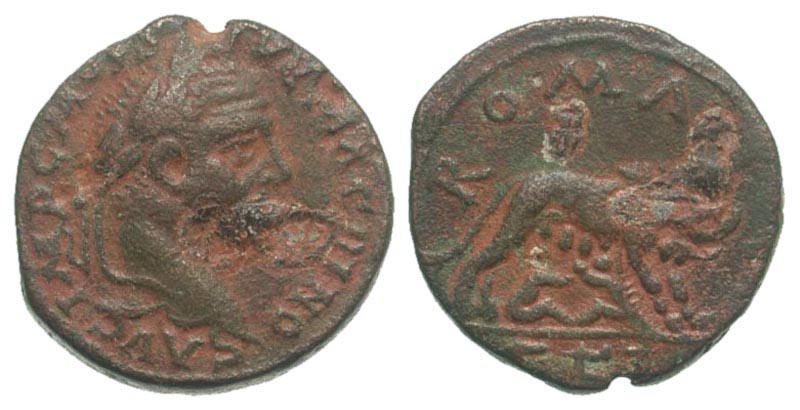 Syria, Seleucis and Pieria. Laodicea ad Mare. Macrinus. A.D. 217-218. AE 27 (27.0 mm, 16.69 g, 7 h). IMP C M OP SEVE MACRINOS AVG, laureate head right / ROMAE FEL, she-wolf standing right, head turned back, suckling the twins Romulus and Remus. BMC 97 var (obv legend); L&K 2097 var. (same); SNG Cop -. VF, red patina. Die flaw on both obverse and reverse.