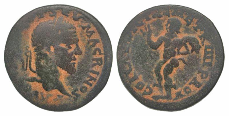 Syria, Seleucis and Pieria. Laodicea ad Mare. Macrinus. A.D. 217-218. AE 29 (28.9 mm, 16.14 g, 12 h). [IMP C M O]P SEV MACRINOS AVG (or similar), laureate head right / COL LAVDICIAE MHTR IIII PROY, Marsyas standing left, extending arm and holding wine skin over shoulder. SNG Cop -; BMC -. VF, black patina with red highlights. Very Rare.