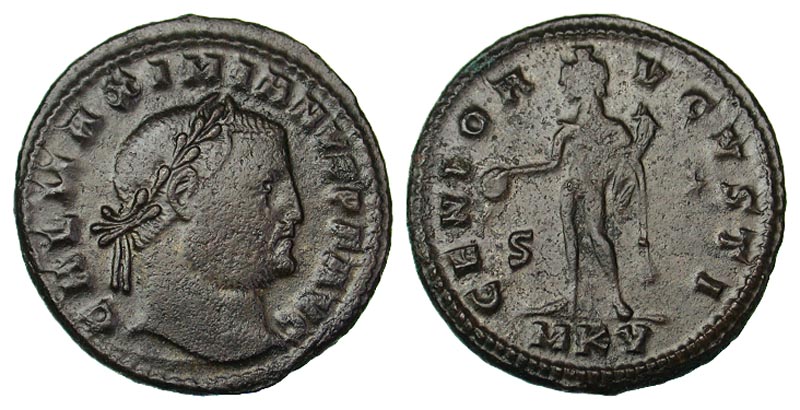 Galerius. A.D. 305-311. Æ Follis (25.5 mm, 8.56 g, 6 h). Cyzicus, A.D. 309-310. GAL MAXIMIANVS PF AVG, laureate head right / GENIO AVGVSTI, Genius standing left, holding patera and cornucopia; S-* in fields, MKV in exergue. RIC 53. VF.