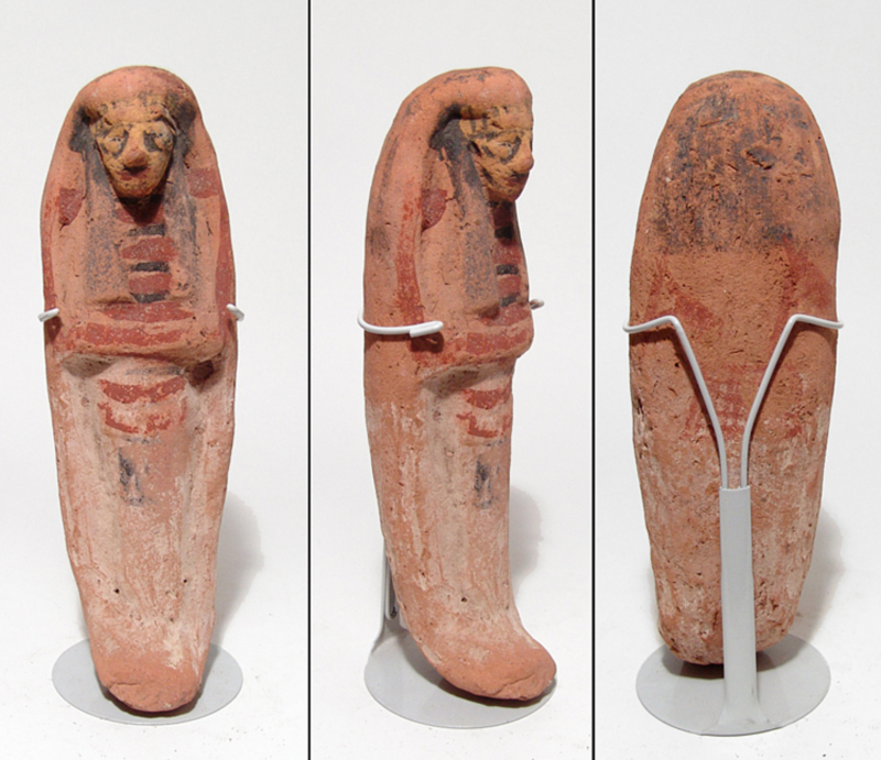 A Large and Substantial Egyptian Terracotta Ushabti. A large and substantial terracotta ushabti, New Kingdom, 19th ï¾ 20th Dynasty, c. 1292 ï¾ 1075 BC, mummiform, wearing tripartite headdress, arms crossed over chest, holding implements indicated with red pigment. A more unusual type with wide and thick back side. H: 9ï¾ (22.9 cm). Intact with much remaining pigment and earthen deposits. Est Value $600 - $700. Ex Nomis Antiquities.
