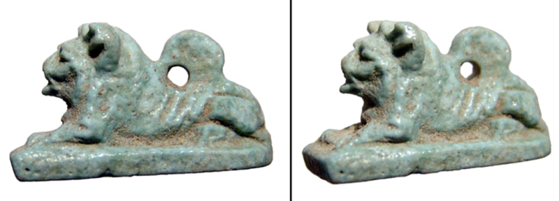 An Egyptian Faience Amulet of a Recumbent Lion. An Egyptian faience amulet of a recumbent lion, Late Period, c. 664 ï¾ 30 BC, nicely detailed with light blue glaze. Intact with suspension loop at the back. L: 23mm. Ex Orange county private collection. Est Value $200 - $300.