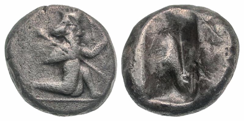 Achaemenid Kingdom. Artaxerxes I - Artaxerxes II. Ca. 450-375 B.C. AR siglos (16.1 mm, 5.39 g, 12 h). Persian king or hero in kneeling-running stance right, holding spear and bow / Rectangular incuse punch. Carradice type IIIb, late; SNG Kayhan 1029; Sunrise 29. aVF.