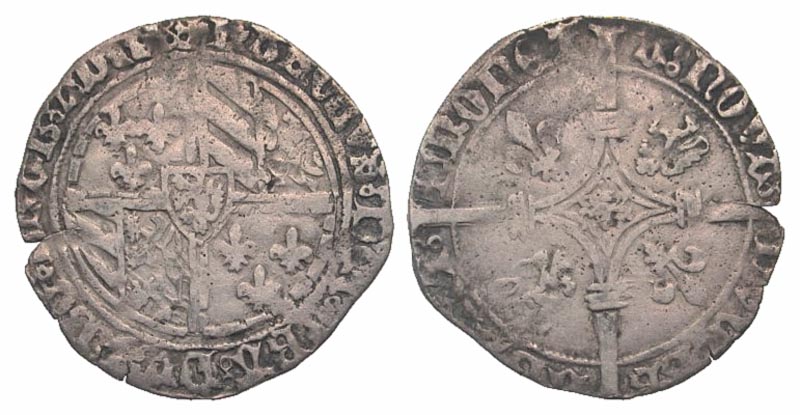 Low Countries, Brabant. Karel de Stoute (the Bold). 1467-1477. AR double gros vierlander (28.4 mm, 2.77 g, 12 h). Leuven mint. Coat of arms / Long cross with lily at center, four lilies in field around. De May 123; De Witte 506. aVF.